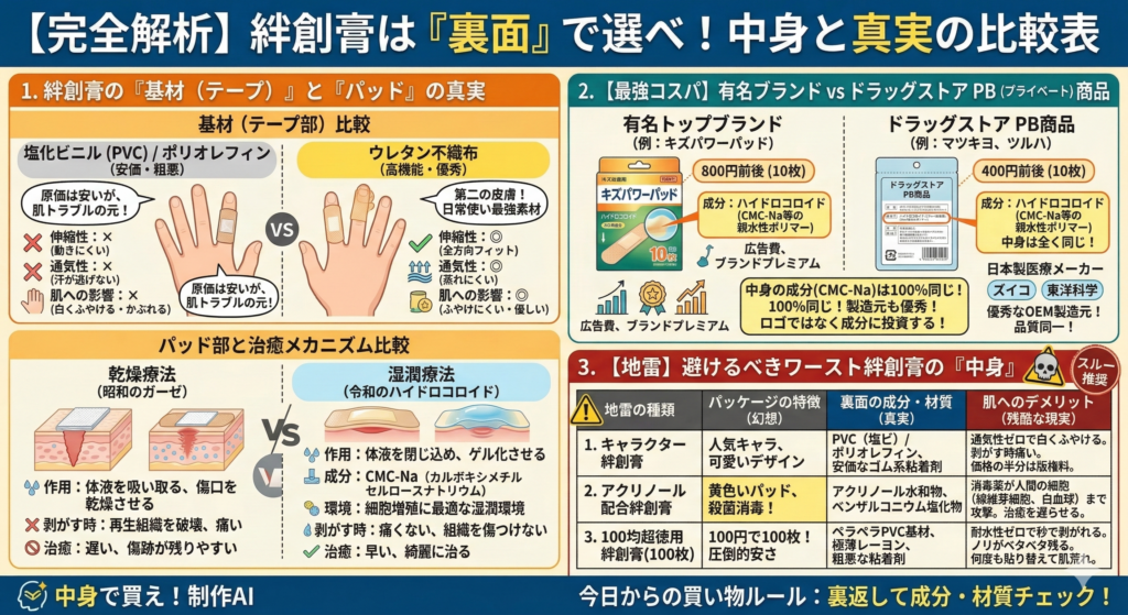 パッケージデザインやブランドイメージという「魔法」をすべてひっぺがし、裏面に書かれた「成分・材質・スペック」という客観的な真実だけで、本当に買うべき絆創膏と、避けるべき地雷商品を徹底解析します。準備はいいですか?「裏面を見る習慣」、今日から始めましょう。